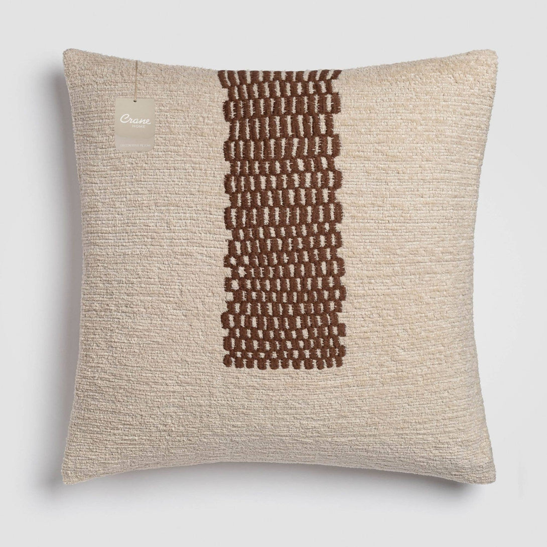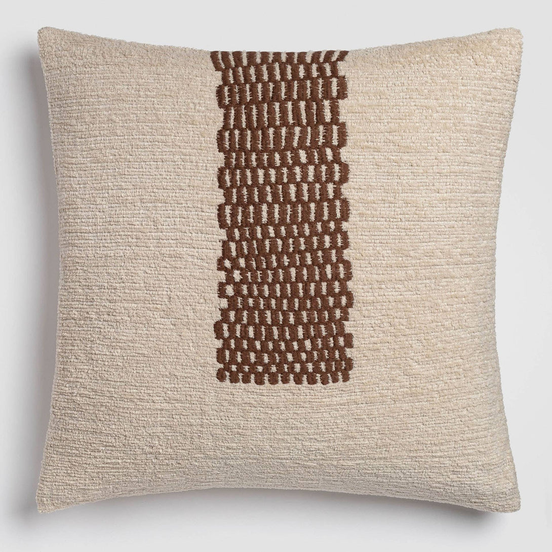Featuring a cozy off-white chenille base and abstract checkered brown embroidery, this decorative pillow delivers a harmonious blend of softness and structure. Ideal for grounding minimal and earthy decor styles.