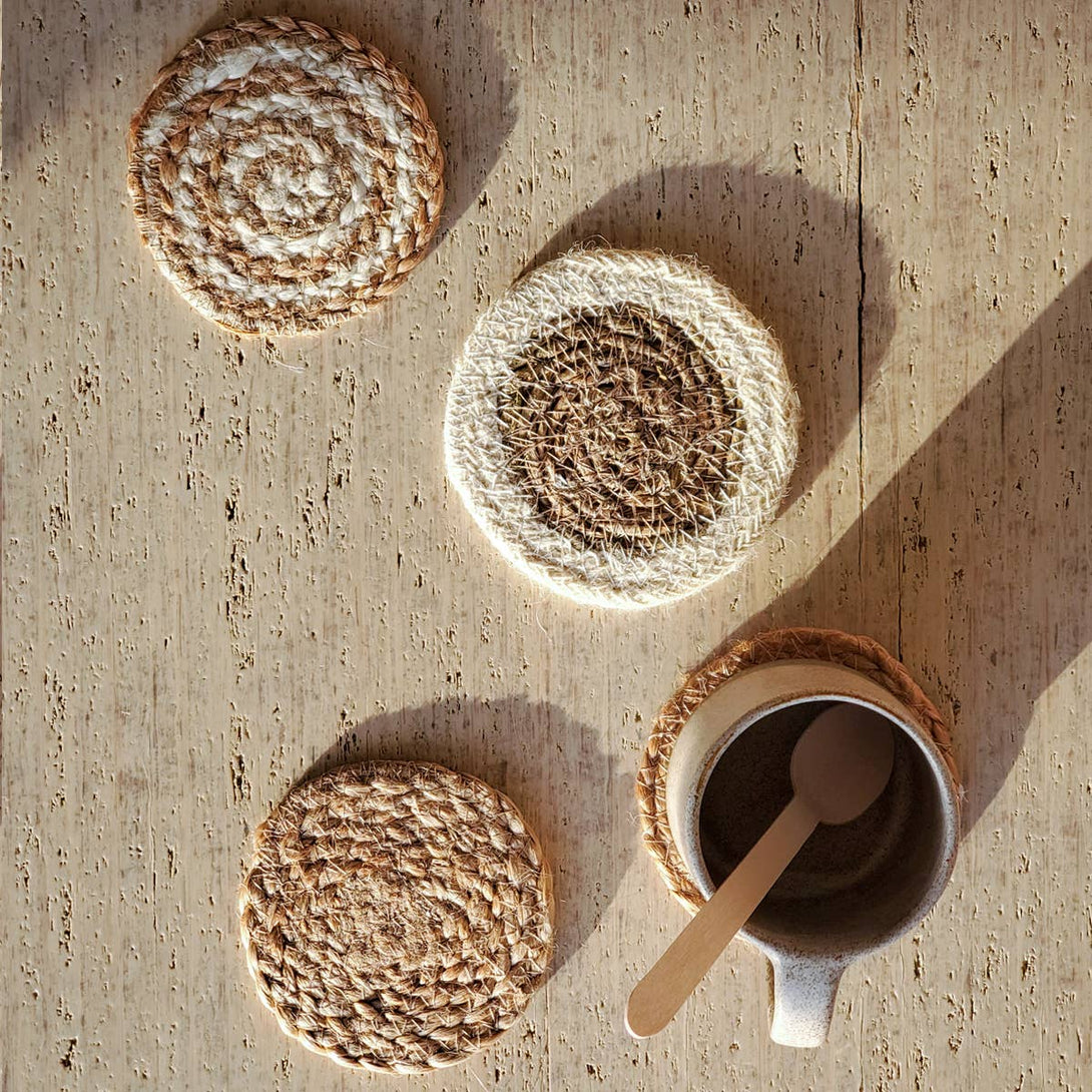 An assorted coaster gift set (x 4) handmade with 100% Jute and seagrass, these coasters are an easy gift for friends & family or a stylish way to keep your table protected from scratches and watermarks. Durable, absorbent, and neutral enough to go with any decor style. Include a reusable "Hand Screen Printed Drawstring Pouch" handmade by Bangladesh Women Artisans. - Perfect Sustainable Gift for Earth-Loving Lovers! Handmade by Fair Trade artisan in Bangladesh.