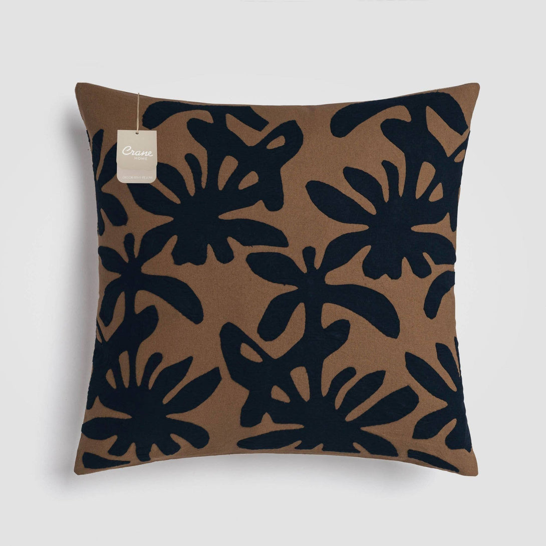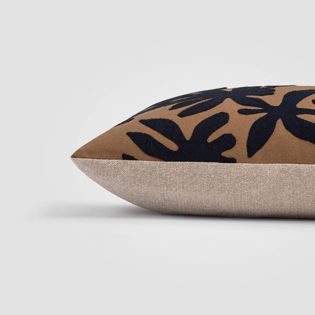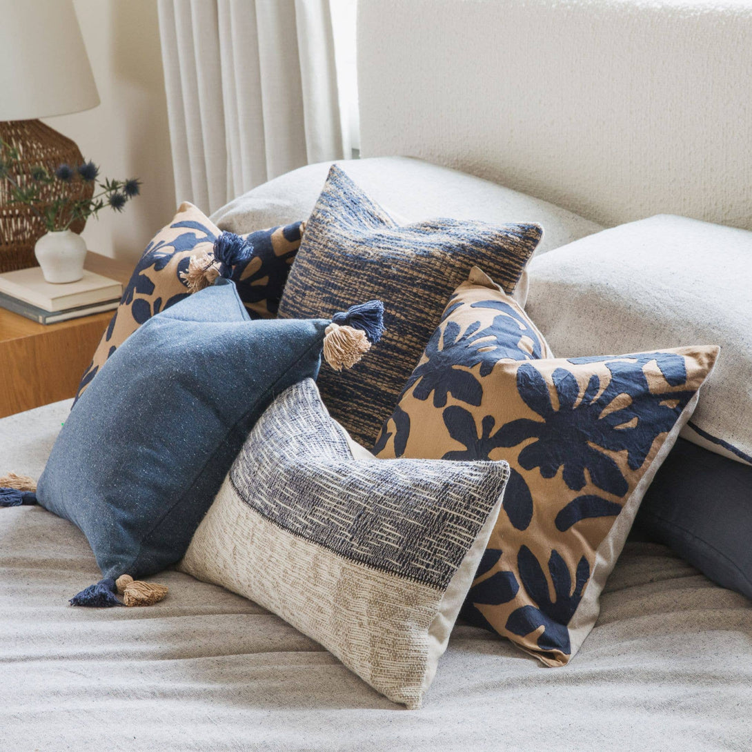 Organic shapes inspired by coral reefs and tide pools dance across a soft khaki canvas in rich indigo hues. This cotton khaki throw pillow merges abstract applique with coastal calm, adding both artistry and texture to your decor.