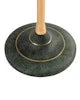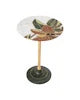 The Roselle Stone inlay accent table has a Carrara marble top that features an exquisite floral inlay in a lively mix of light green, yellow, rosy pink, and dark green marble. Supporting this elegant surface is a slender stem in a brass finish that complements the thin rings of brass inlay encircling the green marble base, which is hand-chiseled to create a striking striated pattern. This design was produced in a limited edition of ten.