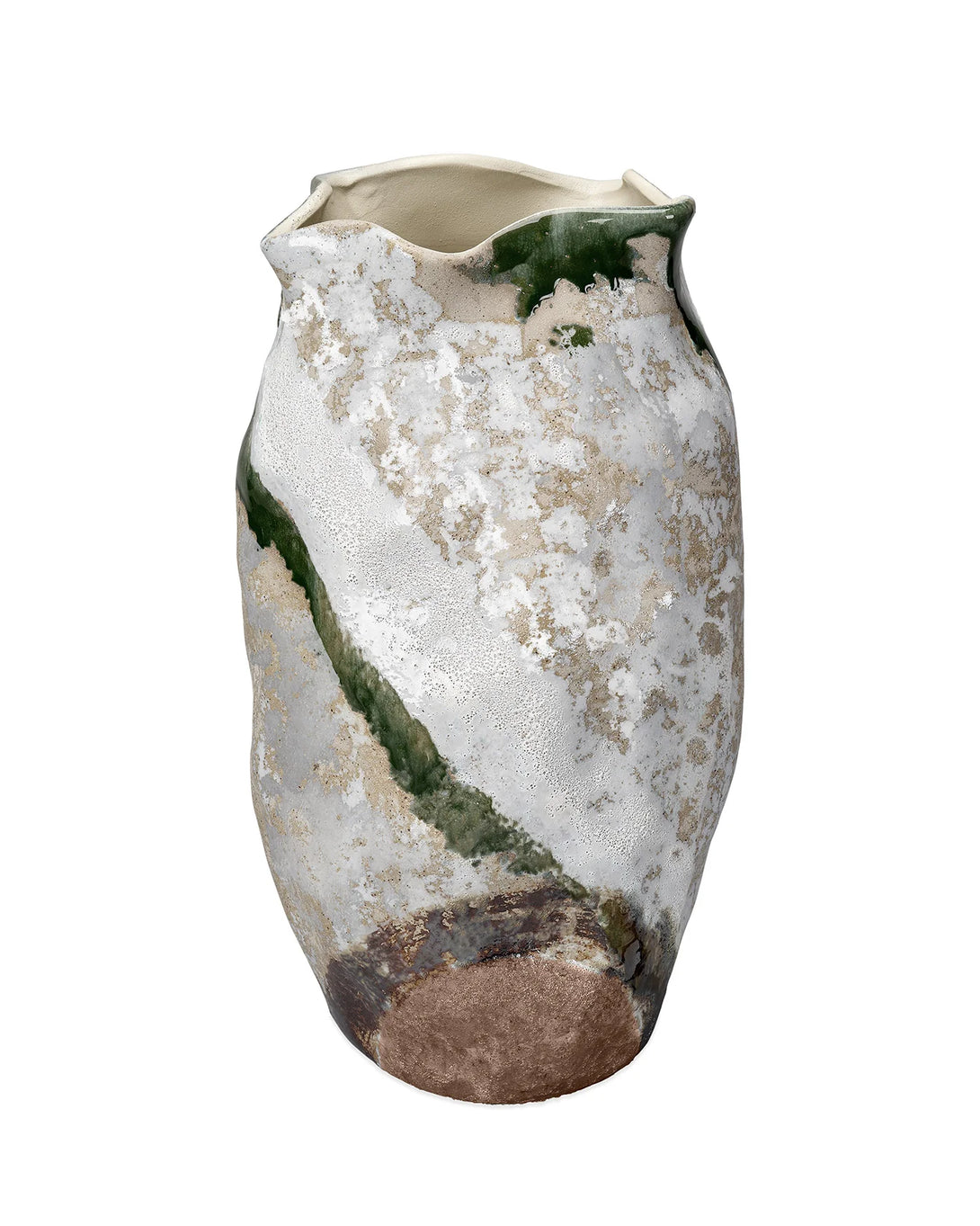 The design of these vessels was inspired by the beauty of antiquities unearthed after centuries in sand. The interior of the watertight vase is finished and smooth, but the exterior has a rougher, textural feel that is enhanced with a trio of reactive glazes in cream, green, and tan. As they are each artisan crafted of fine ceramic, no two of these magnificent vessels will be identical. Generously sized at a foot and a half in height, these are even more stunning when filled with dried reeds or feathers.