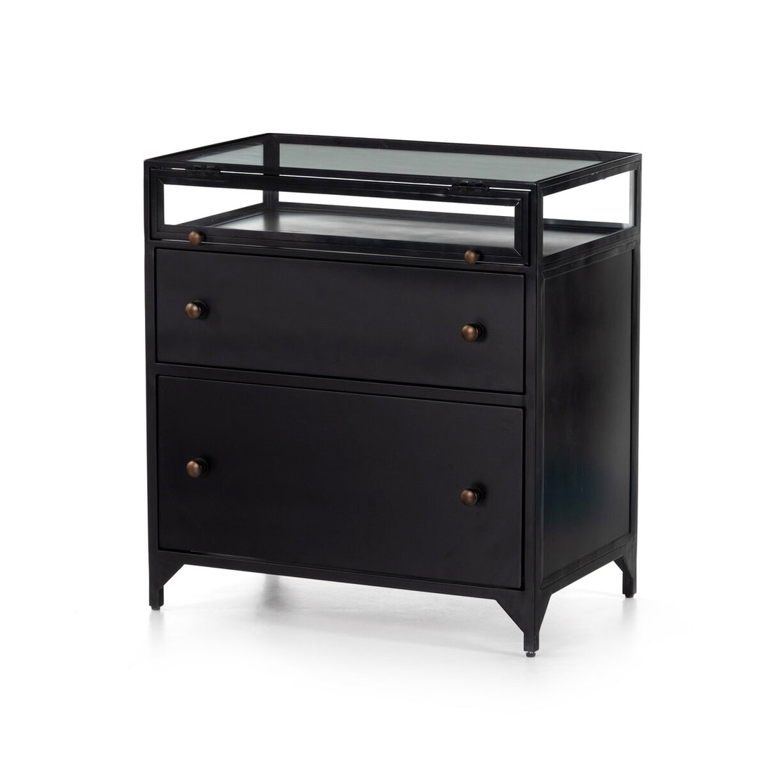 A shadowbox-inspired nightstand gives your inner collector a place to play. Store favorite keepsakes behind a clear glass enclosure. Matte black iron casing offers two spacious drawers, with bronze-finished knobs for cool contrast.